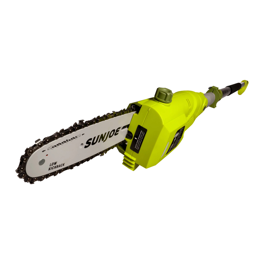 - Tumia mnyororo wa kurudi nyuma chini na upau wa mwongozo uliotolewa na msumeno huu wa mnyororo wa nguzo. Tumia tu sehemu halisi za uingizwaji za Snow Joe® + Sun Joe® zilizoundwa mahsusi kwa matumizi na msumeno huu wa mnyororo wa nguzo.