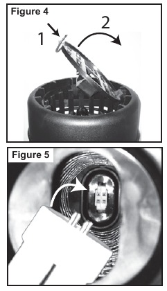 Kumbuka: Ikiwa kifaa kitashindwa kuwaka baada ya kubadilisha balbu, shusha kifaa chini na uondoe balbu na ukae tena meno 4 ya balbu kwenye soketi.