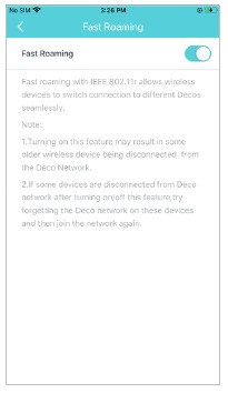 Washa Roaming ya Haraka ili kuruhusu mtandao wako wa ndani kubadilisha vifaa vyako visivyo na waya ili kubadilisha muunganisho wa vifaa vyako visivyo na waya ili kubadilisha muunganisho kwa Deco tofauti.