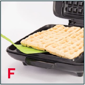 - Mara tu chakula chako kimepikwa kulingana na upendeleo wako, fungua Kifuniko na uondoe kwa uangalifu waffle(s) na kifaa cha kupikia cha nailoni au silikoni kinachostahimili joto. Unapomaliza kupika, ondoa Kitengeneza Waffles Kisichotiririka kutoka kwa umeme na uiruhusu ipoe kabla ya kuhamisha au kusafisha (picha F).