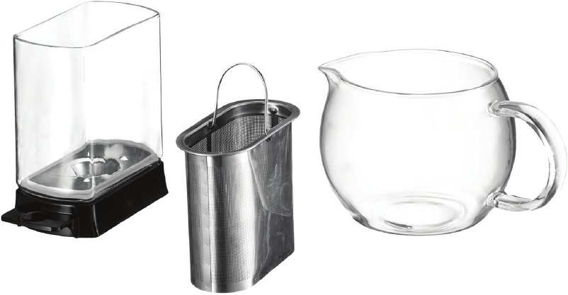 Tundu la mvuke lililoundwa kwa ustadi hufunguka juu ya paneli ya Msingi na wakati inafanya kazi, mikono na uso vinapaswa kuwekwa mbali. Mtungi wa glasi hukaa kwenye Bamba jeusi la Sensor, ambalo ni sehemu ya mfumo wa usalama. Ikiwa mtungi wa glasi hauko kwenye Bamba la Sensor, mfumo wa kutengeneza chai hautaanza. - Chumba cha Chai cha Kioo: Chumba cha Chai cha Kioo na Kichujio cha Chuma cha pua cha Ziada ni vipengele vya mifumo bora zaidi ya kuchuja chai duniani kote. Chumba cha glasi hushikilia joto na hupinga uchafu, wakati kichujio cha chuma cha pua cha ziada hunasa vipande vidogo zaidi vya chai iliyolegea. Kwa pamoja, ni njia safi ya maji ya moto inapochuja kupitia kichujio cha chuma cha pua, huingiza chai na kutiririka ndani ya mtungi wa glasi.