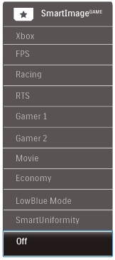 | 11 | | Menyu ya Mchezo ya SmartImage. Kuna chaguo nyingi: Xbox, FPS, Racing, RTS, Gamer1, Gamer 2, Movie, Economy, LowBlue Mode, SmartUniformity, Off. Wakati kifuatiliaji kinapokea mawimbi ya HDR, SmartImage itaonyesha menyu ya HDR. Kuna chaguo nyingi: Xbox, HDR Game, HDR Movie, HDR Photo, DisplayHDR 1000, Personal, Off. |