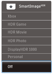 | 5 | | Menyu ya Mchezo ya SmartImage. Kuna chaguo nyingi: Xbox, FPS, Racing, RTS, Gamer1, Gamer 2, Movie, Economy, LowBlue Mode, SmartUniformity, Off. Wakati kifuatiliaji kinapokea mawimbi ya HDR, SmartImage itaonyesha menyu ya HDR. Kuna chaguo nyingi: Xbox, HDR Game, HDR Movie, HDR Photo, DisplayHDR 1000, Personal, Off. |