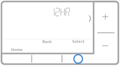 - 12HR inaonyeshwa. Bonyeza + au - ili kuchagua saa ya saa 12 au saa ya saa 24. Bonyeza Select (Chagua).