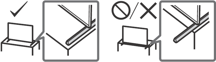 - Sakinisha TV ili Stendi ya Juu ya Jedwali ya TV isitoke nje ya stendi ya TV (haijatolewa). Ikiwa Stendi ya Juu ya Jedwali itatoka nje ya stendi ya TV, inaweza kusababisha seti ya TV kupinduka, kuanguka chini na kusababisha majeraha ya kibinafsi au uharibifu wa TV.