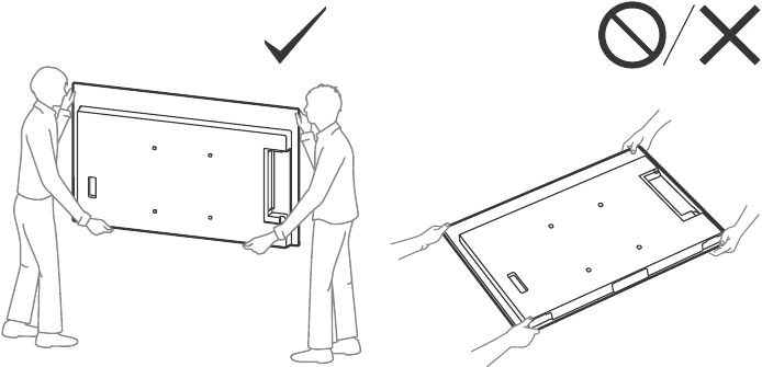 - Unaposafirisha seti ya TV kwa mkono, shikilia kama inavyoonyeshwa hapa chini. Usiweke mkazo kwenye paneli na fremu inayozunguka skrini.