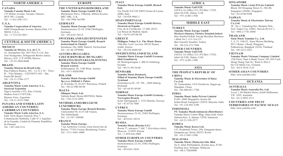 - Kifaa hiki hakina sehemu zinazoweza kutumiwa na mtumiaji. Usifungue kifaa au ujaribu kutenganisha sehemu za ndani au kuzirekebisha kwa njia yoyote. Ikiwa inaonekana kuwa haifanyi kazi vizuri, sitisha matumizi mara moja na uikague na wafanyakazi wa huduma waliohitimu wa Yamaha.