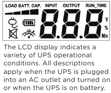 Mpangilio wa kengele (LE1000DG): Kengele inayosikika inaweza KUWASHWA au KUZIMWA kwa kubonyeza kitufe cha POWER haraka mara mbili. Mpangilio chaguo-msingi ni Kengele Imewashwa. Ili KUZIMA Kengele, bonyeza kitufe cha nishati haraka mara mbili. Utasikia milio miwili mifupi wakati Kengele Imezimwa. Ili KUWASHA Kengele tena, bonyeza kitufe cha nishati haraka mara mbili. Utasikia mlio mmoja mfupi wakati Kengele Imewashwa. *Wakati Kengele Imezimwa, hakutakuwa na arifa inayosikika wakati UPS inafikia hali ya chini ya betri. - Kionyeshi cha Nishati Imewashwa