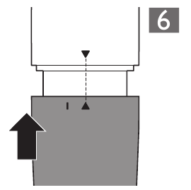 - Ili kuambatisha mojawapo ya viambatisho, pangilia kiashiria cha kufunga kwenye kiambatisho na dalili ya 'hakijafungwa' na uweke kiambatisho kwenye kishikio. Kisha geuza kiambatisho kwa mwendo wa saa hadi kiashiria cha kufunga kielekeze kwenye dalili ya 'kimefungwa' (I). (Mchoro 8)