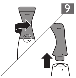 - Ili kuondoa kiambatisho, kigeuze kinyume cha mwendo wa saa hadi kiashiria cha kufunga kielekeze kwenye dalili ya 'hakijafungwa'. Kisha vuta kiambatisho kutoka kwenye kishikio. (Mchoro 9)
