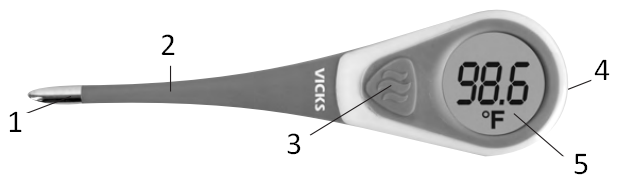 Vicks® ComfortFlex™ Dijital Termometre, sıcaklık ölçümünü daha iyi anlamak için sıcaklık okumasıyla birlikte bir renk göstergesi sunan patentli "Fever InSight" özelliği ile birlikte gelir.- 97.0-98.9°F arasındaki okumalar için, LCD, ölçümün kabul edilebilir bir aralıkta olduğunu gösteren arka ışık rengi olarak yeşil gösterecektir.