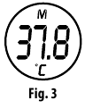 - En yüksek sıcaklığa ulaşıldığında (genellikle 19 saniye içinde), 5 bip sinyali duyulacak ve " °C" işareti yanıp sönmeyi durduracaktır. Sıcaklık ölçümü artık okunmaya hazırdır ve termometre çıkarıldığında değişmeyecektir.