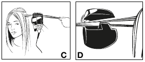 - Şekillendiriciyi buklelerin başlamasını istediğiniz yere yerleştirin. Saç bölümü düz olmalı ve şekillendiricinin ortasından düzgün bir şekilde yerleştirilmelidir (Şekil c ve d).
