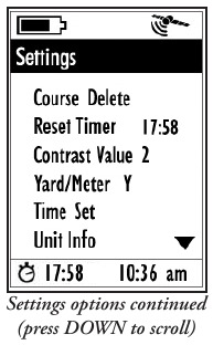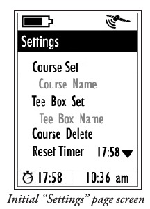 Zamanınızın çoğunu Oyun sayfasında, bulunduğunuz yerden her bir yeşilliğe olan mesafeyi kontrol ederek geçirecek olsanız da, öncelikle bir parkur ve tee kutusu seçmelisiniz, bu nedenle bunun yapıldığı Ayarlar sayfasına bir göz atalım. Başlangıç ekranından, AYARLAR'ı seçmek (vurgulamak) için bir kez Aşağı tuşuna basın ve ENTER tuşuna basın. Sekiz öğenin bir listesini göreceksiniz (listenin tamamında gezinmek için AŞAĞI tuşuna basmaya devam edin):