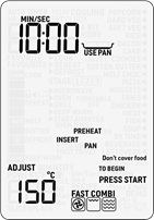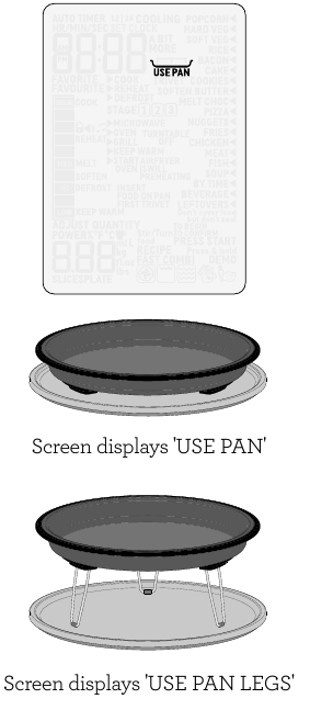 - Seçilen pişirme fonksiyonu için Combi Crisp (Kombi Çıtır) tavanın kullanılması gerektiğinde, ekranda 'USE PAN' (TAVA KULLAN) veya 'USE PAN LEGS' (TAVA AYAKLARINI KULLAN) kelimeleri görünecektir.