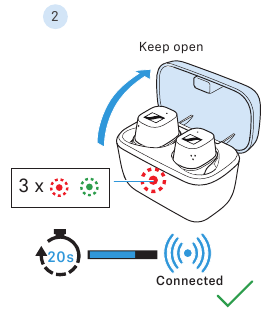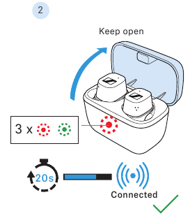 Kulaklıklar başarıyla sıfırlandıktan ve birbirleriyle eşleştirildikten sonra, şarj kutusunun LED'i 3 kez kırmızı ve yeşil yanar.