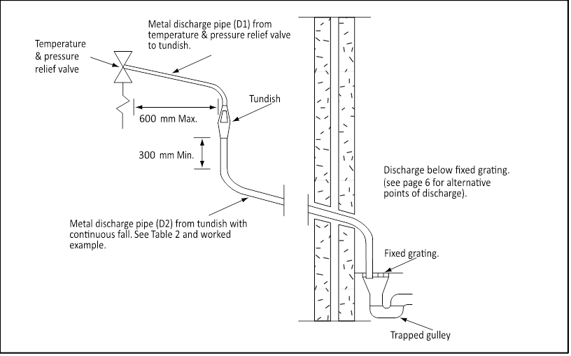 Aşağıdakiler, Yapı Yönetmelikleri G3'ü ifade eder. Tüm tahliye vanası tahliye boru tesisatı için bu kurallara uyulması zorunludur.- Hunili drenaj dikey olmalı, havalandırmasız sıcak su depolama sistemiyle aynı alanda bulunmalı ve güvenlik cihazına mümkün olduğunca yakın ve daha aşağıda takılmalı, valf çıkışı ile hunili drenaj arasında 600 mm'den fazla boru olmamalıdır.