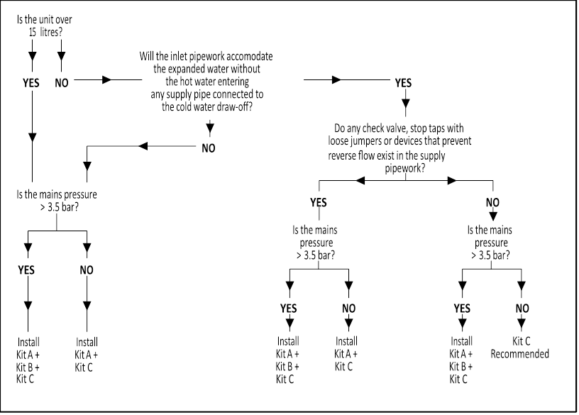 Not: Daha fazla bilgi için lütfen kontrollerin seçilmesi konusunda rehberlik sağlayan akış şemasına bakın. Kurulum, ilgili tüm Su Yönetmelikleri/Tüzükleri ve Yapı Yönetmeliklerine uygun olmalıdır. Kurulumu yapan kişi, maksimum su temini basıncının teyidi için yerel su idaresine başvurmalıdır.
