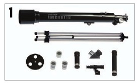 - Teleskobunuzu ambalajından çıkarın ve tüm parçaların mevcut olduğunu doğrulayın. PowerSeeker 50AZ'niz şunları içerir: mercek gölgeliği takılı optik tüp; orta destek braketi ve aksesuar tepsili tripod; üç göz merceği; 3x Barlow lens, yıldız diyagonali, braketli bulucu dürbün ve 1,5x görüntü dikleştirme göz merceği.
