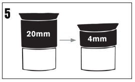- TEBRİKLER! ARTIK İLK GÖK CİSMİNİZİ GÖZLEMLEDİNİZ! Ay'a daha yakından bakmak için, odaklayıcıdaki ayar vidalarını gevşetin ve 20 mm'lik göz merceğini çıkarın. 4 mm'lik göz merceğinizle değiştirin ve yerine sabitlemek için ayar vidalarını sıkın. 4 mm'lik göz merceği size önemli ölçüde daha fazla büyütme sağlayarak Ay'ın çok daha büyük görünmesini sağlayacaktır.