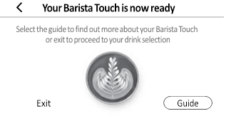 Makine şimdi BEKLEME modunda. - "Guide" (Kılavuz) öğesine dokunun; makine ilk kahvenizi yapmanız için size adım adım yol gösterecektir. Kurulumu tekrarlamak için ü öğesine dokunun ve İçecek Menüsüne gidin veya < öğesine dokunun. Kılavuzu istediğiniz zaman tekrarlamak için Ayarlar Menüsüne gidin.