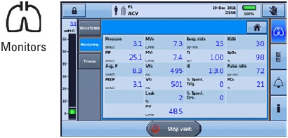 Waveforms | Bemorni nafas yo'llaridagi bosim va oqimning oxirgi 15 soniyasini grafikda ko'rsatadi. Grafik real vaqtda yangilanadi. |