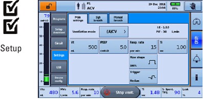 | Settings | Asosiy sozlamalar (Main Settings) Qo'lda nafas olish (Manual Breath) Chuqur nafas olish (Sigh Breath) |