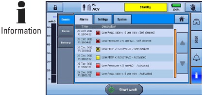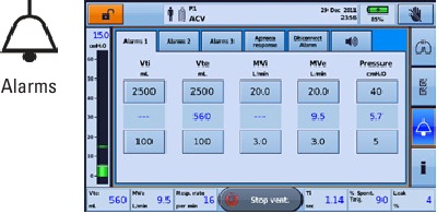 Alarm 1 & 2 | Nafas hajmi (Tidal Volume (Vt)) Daqiqalik ventilyatsiya (Minute Ventilation (Mv)) Nafas olish tezligi (Respiratory Rate) Bosim (Pressure) Past PEEP Ventilyatsiyani to'xtatish (Ventilation Stop) Sızıntı (Leak) NV maskasi / Qayta nafas olish (NV mask / Rebreathing) |