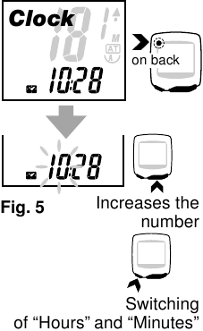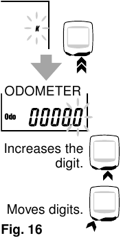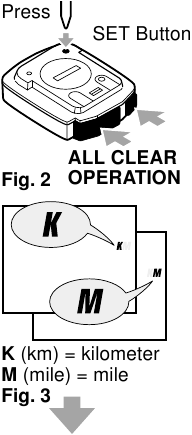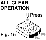 MODE va ST./STOP(S) tugmalarini bosib turgan holda, SET tugmasini ruchka kabi narsa bilan bosing (rasm.15). Kompyuterning butun xotirasi (Odo ma'lumotlari, tezlik shkalasi, g'ildirak sozlamalari va soat vaqti) o'chiriladi va kompyuter masofa shkalasini tanlash rejimida bo'ladi. Ushbu operatsiyani batareya almashtirilganda yoki elektrostatika va boshqalar tufayli g'ayrioddiy displey holatida bajaring.