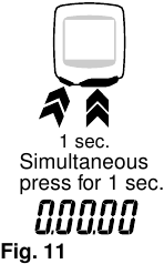 Odo yoki Dst2 dan boshqa har qanday funksiyada MODE tugmasi va ST./STOP(s) tugmasini bir vaqtning o'zida bir (1) soniya bosib turing. MASOFA 1, VAQT, MAKSIMAL TEZLIK va O'RTACHA TEZLIK funksiyalari nolga qaytariladi (Rasm. 11). MASOFA 2 qayta o'rnatilmaydi.