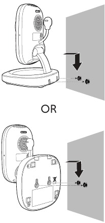 - O'zingizning xohishingizga qarab, qurilmangizni o'rnatish uchun tik yoki yon yo'nalishni tanlang. Go'dak qurilmasining pastki qismidagi yoki orqa tomonidagi devorga o'rnatish teshiklarini devordagi vintlar bilan tekislang. Go'dak qurilmasi joyiga tushguncha pastga siljiting.