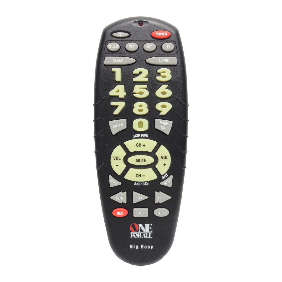 One For All 4 Qurilma uchun pult zavodda RCA TV va VCR, Motorola (GI) kabel qutisi va Toshiba DVD pleerni boshqarish uchun oldindan dasturlangan. Standart brendlardan boshqa qurilmalarni boshqarish uchun quyidagi amallarni bajaring; aks holda ushbu bo'limni o'tkazib yuboring: