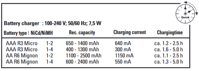 Shuningdek, batareyalarning haddan tashqari zaryadlanishining oldini oladi. - 1, 2, 3 yoki 4 ta batareyani alohida yoki birgalikda zaryadlash mumkin. Turli o'lchamdagi (AA/AAA) va turdagi (NiCd/NiMH) batareyalarni birlashtirish mumkin. Zaryadlash toki shunga mos ravishda sozlanadi.