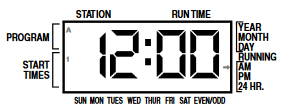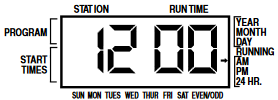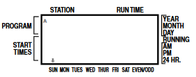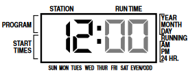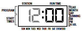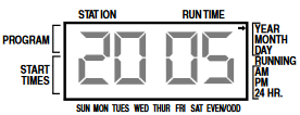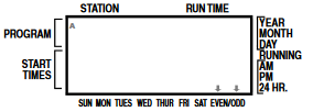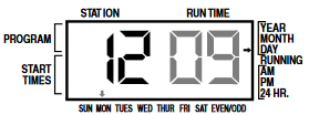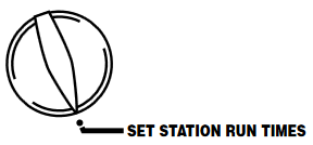 ESLATMA: Diskni RUN (Ishga tushirish) holatiga buraganingizda displeyda ko'rsatilgan stansiya birinchi bo'lib ishga tushadi. Keyin kontroller faqat ketma-ket tartibda sug'orishni davom ettiradi. U oldingi stansiyalarni sug'ormaydi. Misol: Agar siz diskni RUN (Ishga tushirish) holatiga displeyda 3-stansiya ko'rsatilayotganida burasangiz. Kontroller dasturdagi 3 dan 9 gacha stansiyalarni sug'oradi, lekin 1 va 2-stansiyalarga qaytmaydi.