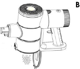 - Yoqish/o'chirish tetigini (A) bosib, changyutgichni yoqing. Indikator chiroqlari (B) yonadi va batareya darajasini ko'rsatadi.