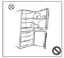 - Hech qanday bolaga muzlatgichga kirishiga yoki unga chiqishiga yo'l qo'ymang; aks holda bolaning bo'g'ilishi yoki yiqilib tushishi mumkin.