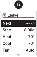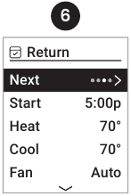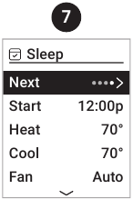 - Wake (Uyg'onish) tafsilotlarini (Start (Boshlash), Heat (Isitish), Cool (Sovutish), Fan (Fan) va/yoki davom etish uchun Next (Keyingi) ni tanlang) sozlang.