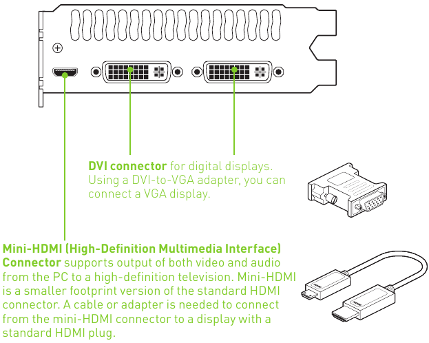 - Kompyuter monitoringiz(laringiz)ni mini-HDMI va DVI ulagichlaridan foydalanib GeForce grafik kartasiga ulang. GeForce GTX grafik kartasini DVI, VGA va HDMI kirishlarini qo'llab-quvvatlaydigan kompyuter monitorlariga ulash mumkin.