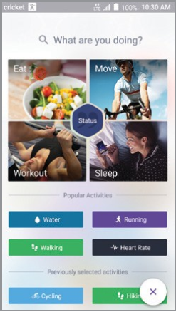 ni bosing va faoliyat turini tanlang (Ovqatlanish, Harakat, Mashq, Uyqu). - Ekranda ko'rsatilgan ko'rsatmalarga amal qiling.