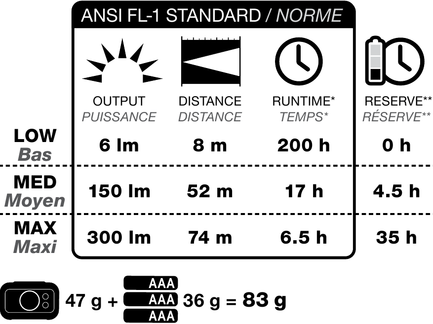 **Zaxira: Chiroq past intensivlikdagi faoliyatlar uchun foydalanish mumkin bo'lgan yorug'likni ishlab chiqaradigan qo'shimcha vaqt (4 metrda 0,25 Lux gacha o'lchanadi.)